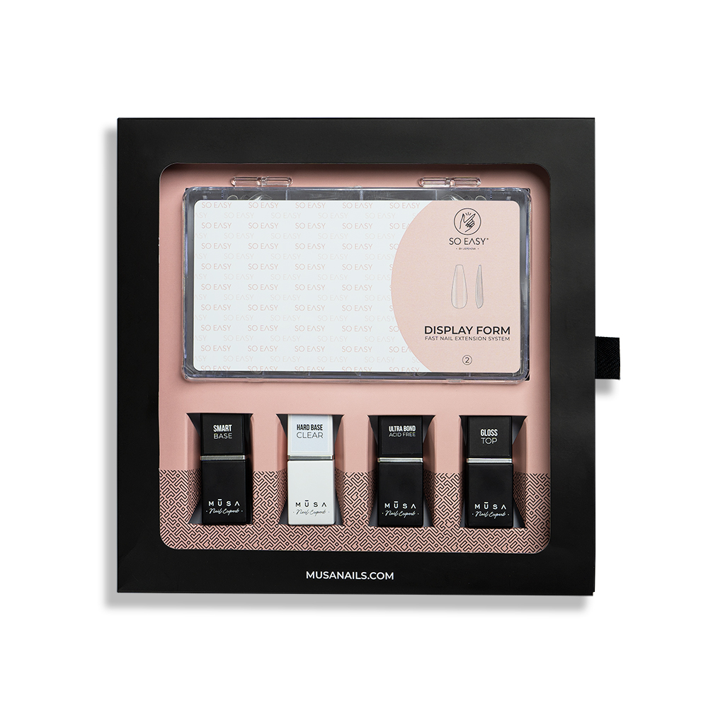SO EASY è un sistema che permette di eseguire una ricostruzione pratica e veloce, ottenendo in maniera semplice, forme perfette e naturali. Utilizzato in combinazione con Hard Base, Gel Builder o Acrylic Gel è possibile ridurre a metà i tempi di una ricostruzione, ottenendo risultati perfetti con eliminazione di quasi tutto il processo di limatura.